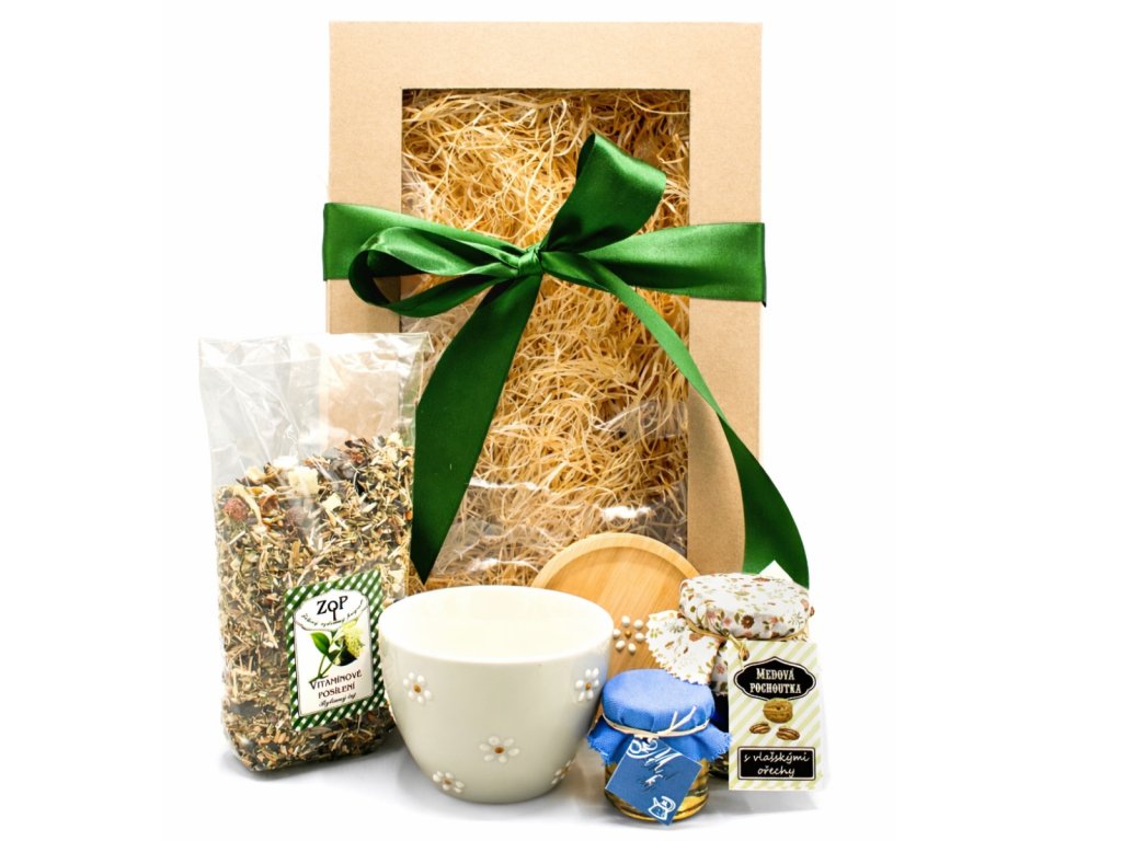 Voňavý set s bylinným čajem, medovou pochoutkou a ručně malovaným hrníčkem s podšálkem. Dárek pro klidné chvíle, které zahřejí tělo i srdce.