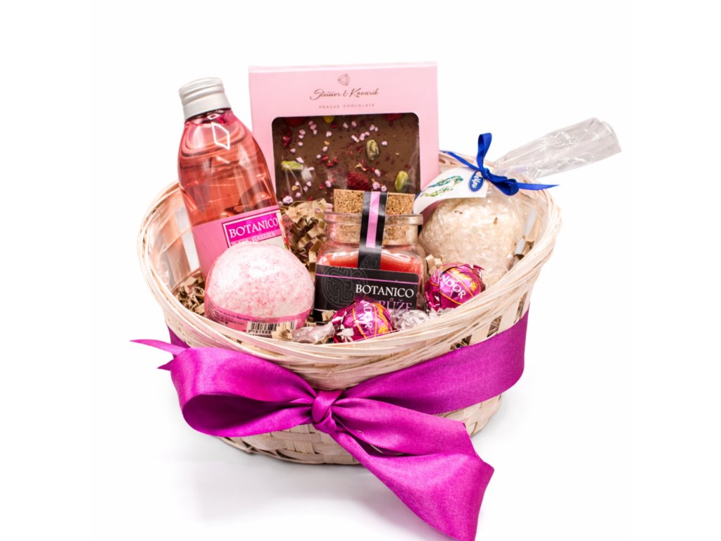 Elegantní dárkový koš plný sladkých a voňavých radostí. Kombinace čokolády a pečující kosmetiky vytváří dokonalý dárek pro chvíle odpočinku a rozmazlování.